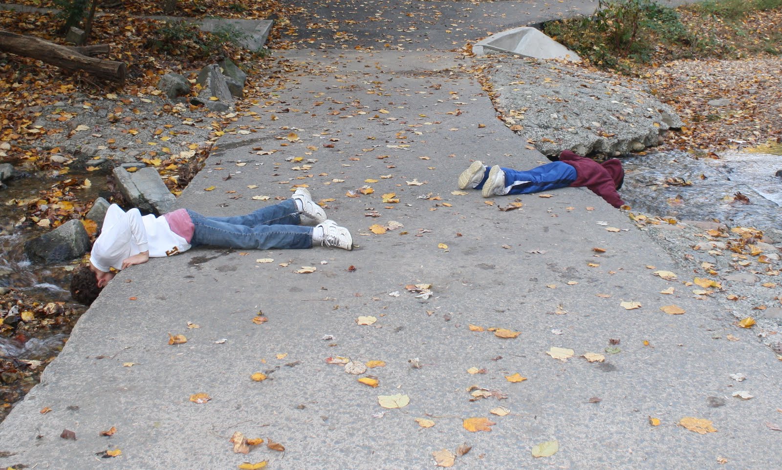 and Bro threw some burgers on the grill.While the burgers were cooking and the picnic was being prepared, Curly and Moe wanted to try crossing the creek without getting their feet wet.